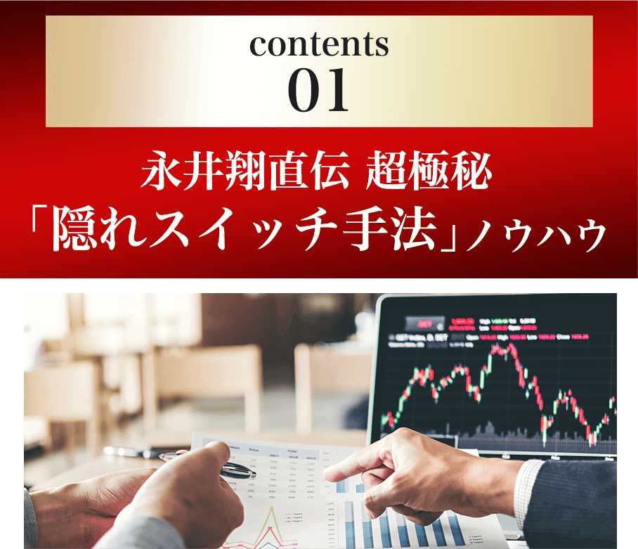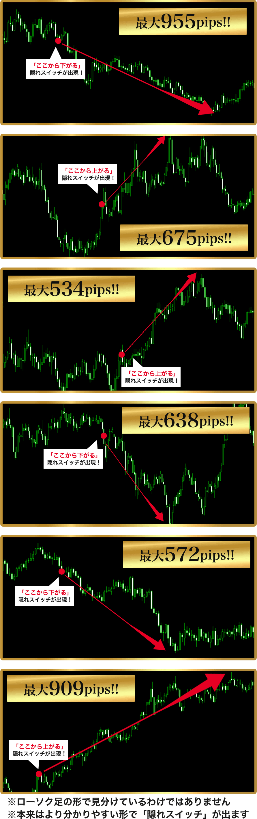 1日10分、エントリーすべきポイントを明確に示してくれる「隠れスイッチ」が出ているかどうかをチェックするだけで、初心者さんから挫折経験者さんまで、短期間のうちに数十万~数百万という爆益を生み出している優位性が非常に高い希少なノウハウとなっています。