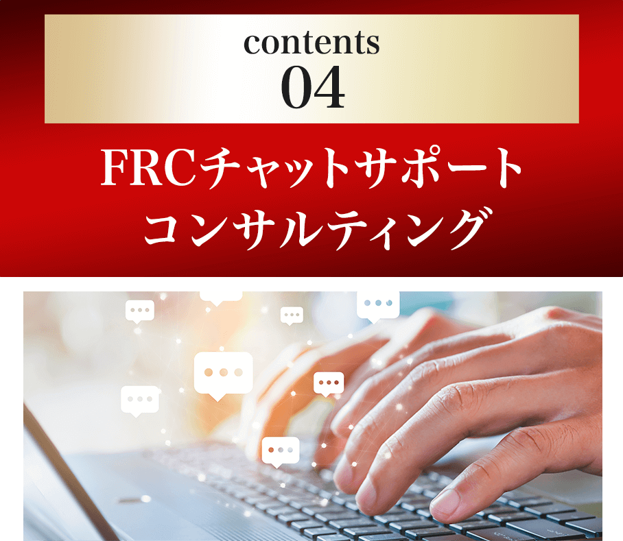 しかしFRCではいつでもどこでも質問ができる、チャットサポートコンサルティングをご用意しているため、何か疑問や不明点が発生しても、逐一解消しながら学習・実践を進めることが可能です。