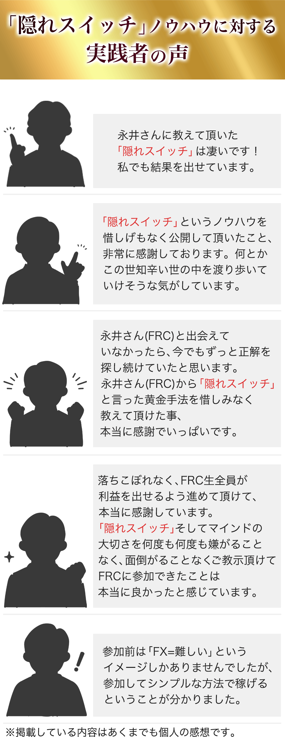そして、FRCでお伝えする「隠れスイッチ」のノウハウは、抜群の再現性を誇り、長期にわたって使い続けられる本物のノウハウです。