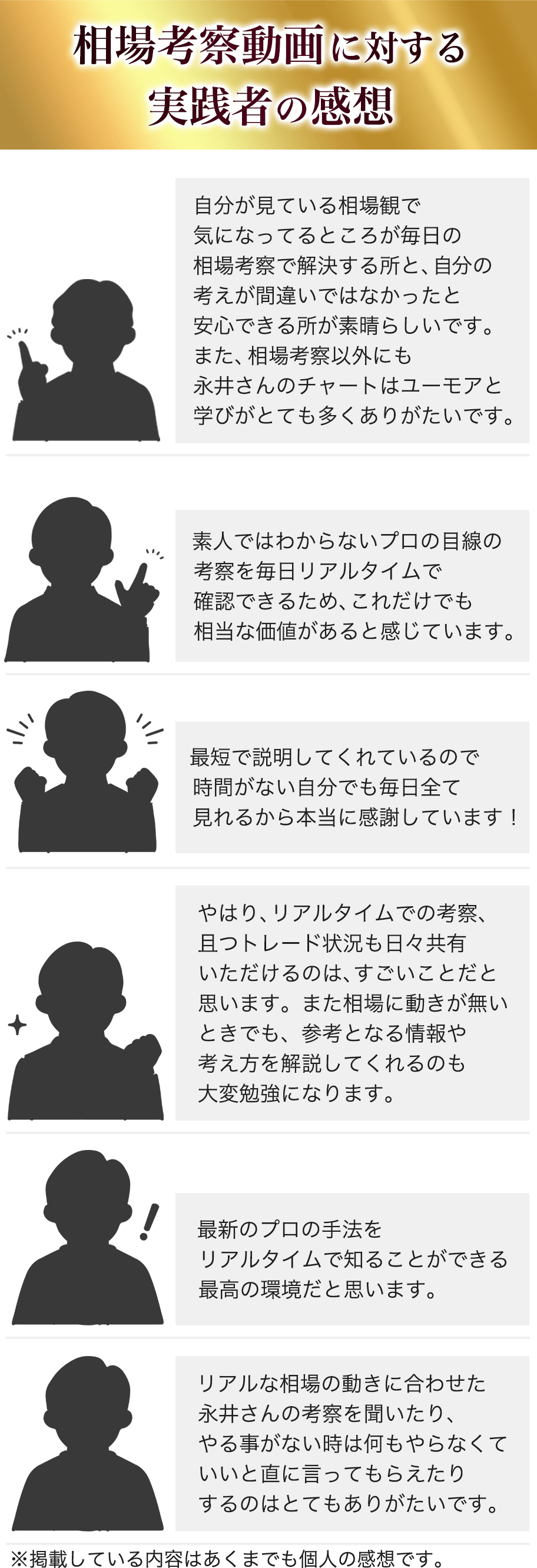FRCでは常に戦略や方向感に迷うことのないよう、私が平日は毎日リアルタイムで撮影したその日の相場考察動画を半年間にわたって配信し続けます。