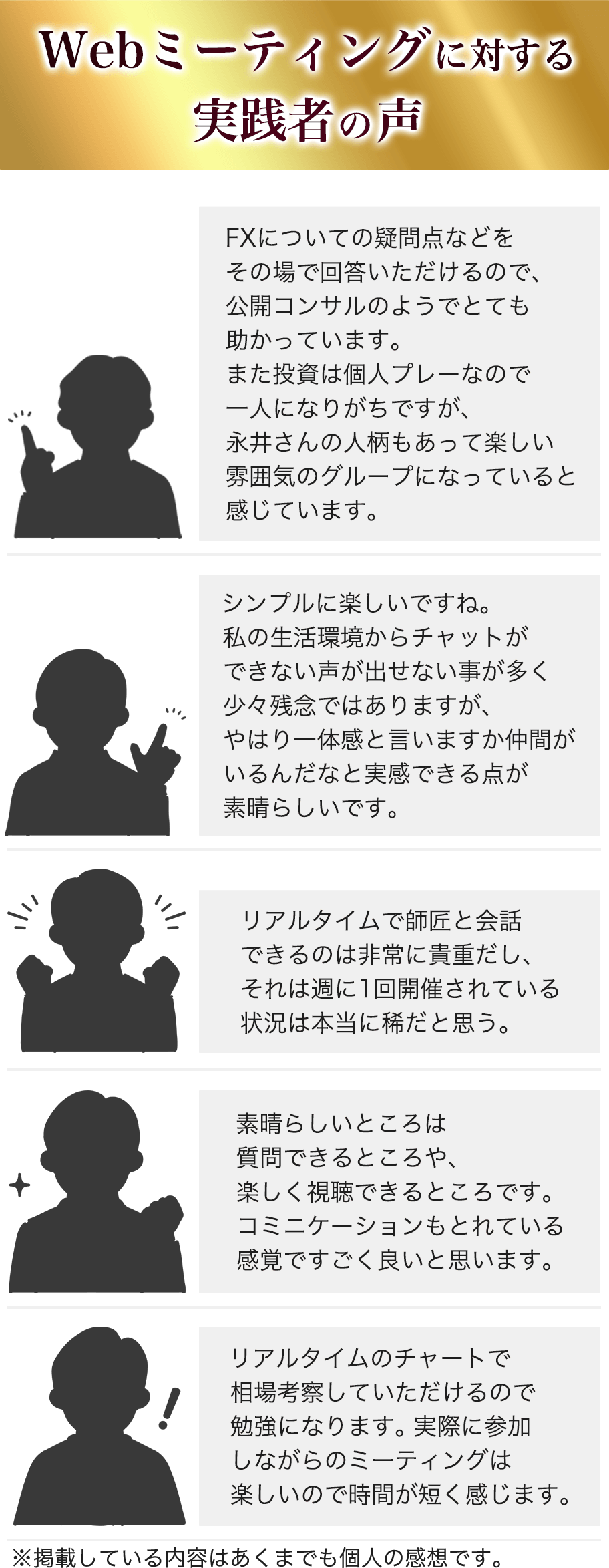 また、このWebミーティングはもちろんトレードに関する様々な講義や考察、情報シェアなどを中心に行いますが、固い雰囲気のミーティングではなく、基本的には交流をしたり、口頭やチャットを使用して双方向の交流ができる非常に楽しい場でもあるので安心してください。